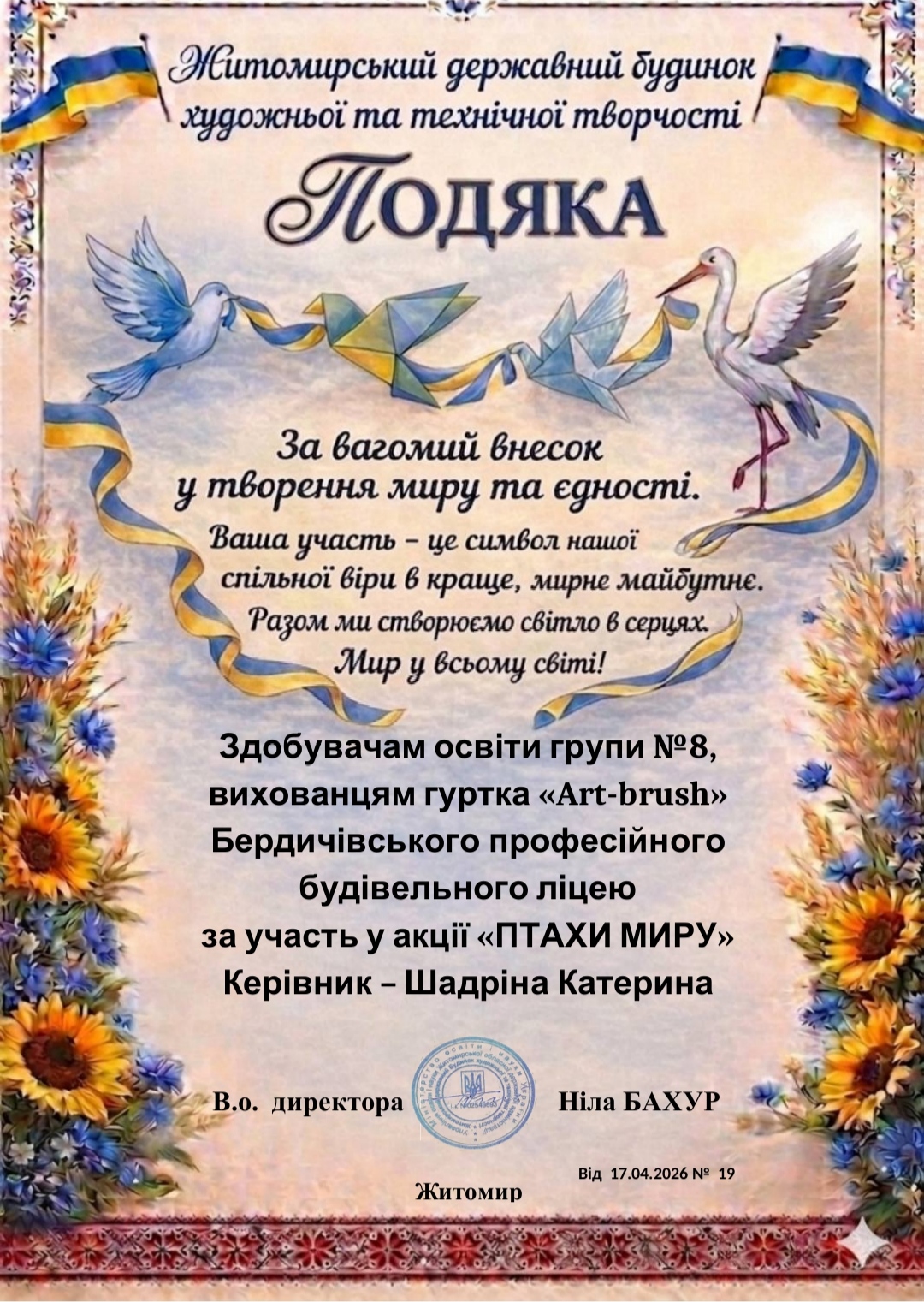 Здобувачі освіти Бердичівського професійного будівельного ліцею вкотре довели, що молодь — це рушійна сила змін, носій добра, миру та єдності. Вихованці гуртка «Art-brush», здобувачі освіти групи №8 під керівництвом викладача Катерини ШАДРІНОЇ взяли активну участь у творчій акції «Птахи миру». Їхні роботи стали символом віри у світле майбутнє, прагнення до гармонії та миру в Україні […]