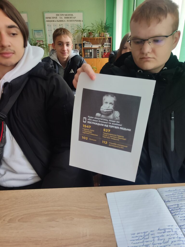 Під час зустрічі здобувачі освіти взяли активну участь в обговоренні реальних історій постраждалих. Особливу увагу було приділено питанням як не стати жертвою торгівлі людьми; куди звертатися по допомогу; які організації в Україні займаються захистом постраждалих.